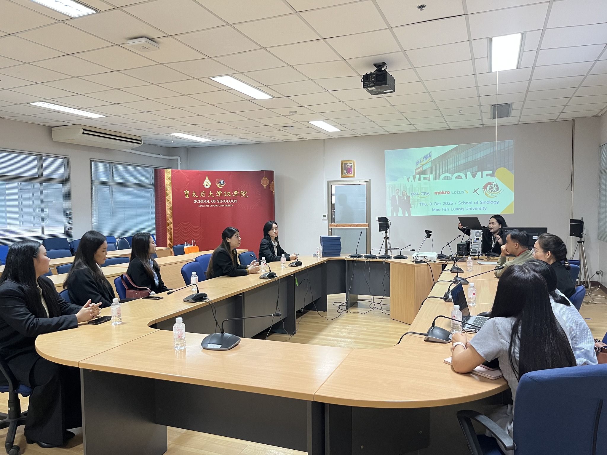 เมื่อวันที่ 9 ตุลาคม 2568 สำนักวิชาจีนวิทยา มหาวิทยาลัยแม่ฟ้าหลวง นำโดย อาจารย์ ดร.มณีพร ศักดิ์สูง ผู้ช่วยคณบดีสำนักวิชาจีนวิทยา พร้อมด้วยคณาจารย์คณะทำงานสหกิจศึกษาให้การต้อนรับเจ้าหน้าที่จากบริษัท ซีพี แอ็กซ์ตร้า จำกัด (มหาชน) หรือ CP AXTRA Makro Lotus’s ในโอกาสเดินทางมาเยี่ยมเยือนและประชาสัมพันธ์ โครงการพัฒนาผู้นำ (Future Leader Program: FLP)